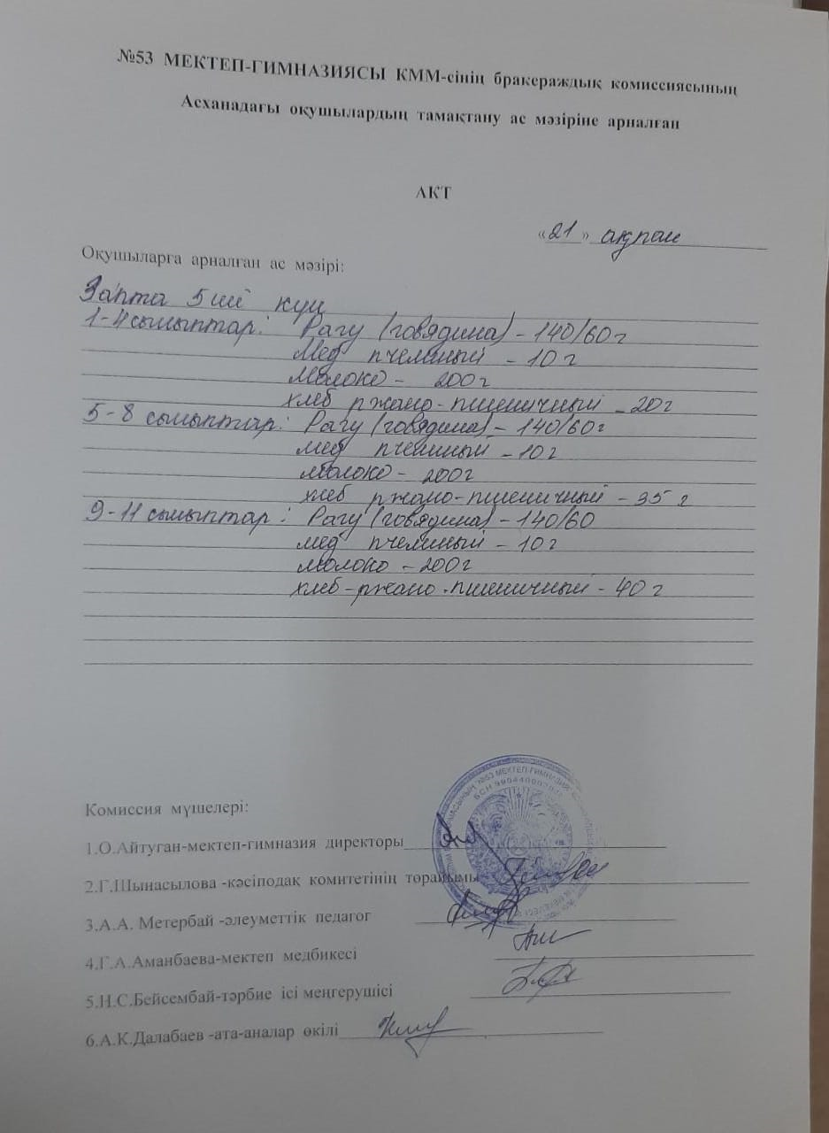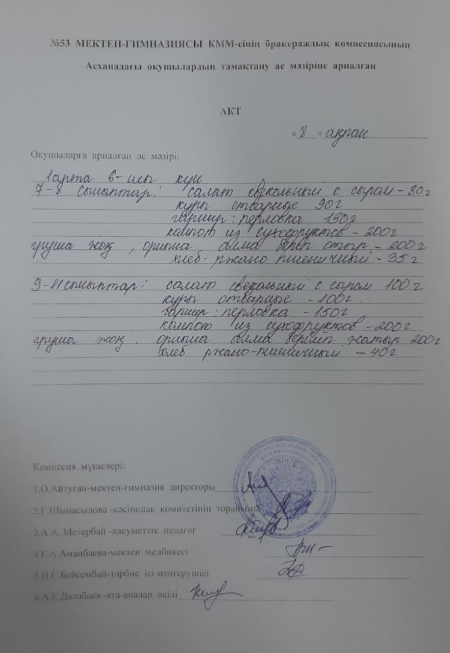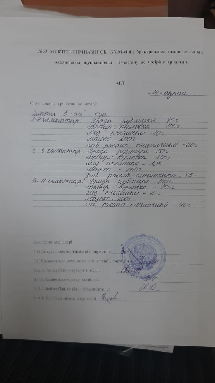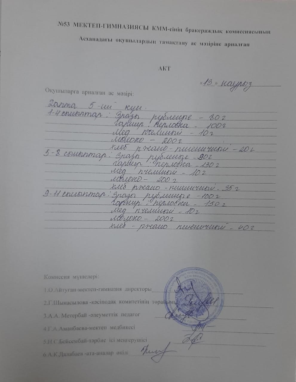 03 ноябрь 2020 0 1 2 3 4 5 Бракераждық комиссияның асханадағы оқушылардың тамақтану ас мәзіріне жүргізген АКТ "Қыс-көктем" мезгілдеріне арналған ас мәзірі бойынша.