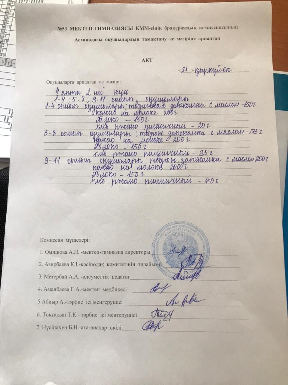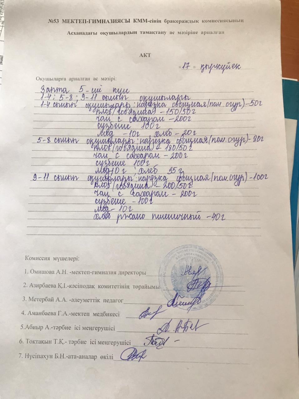 24 сентябрь 2021 0 1 2 3 4 5 №53 МЕКТЕП-ГИМНАЗИЯСЫ КММ-сінің бракераждық комиссиясының актісі Асханадағы оқушылардың тамақтануына арналған ас мәзірі