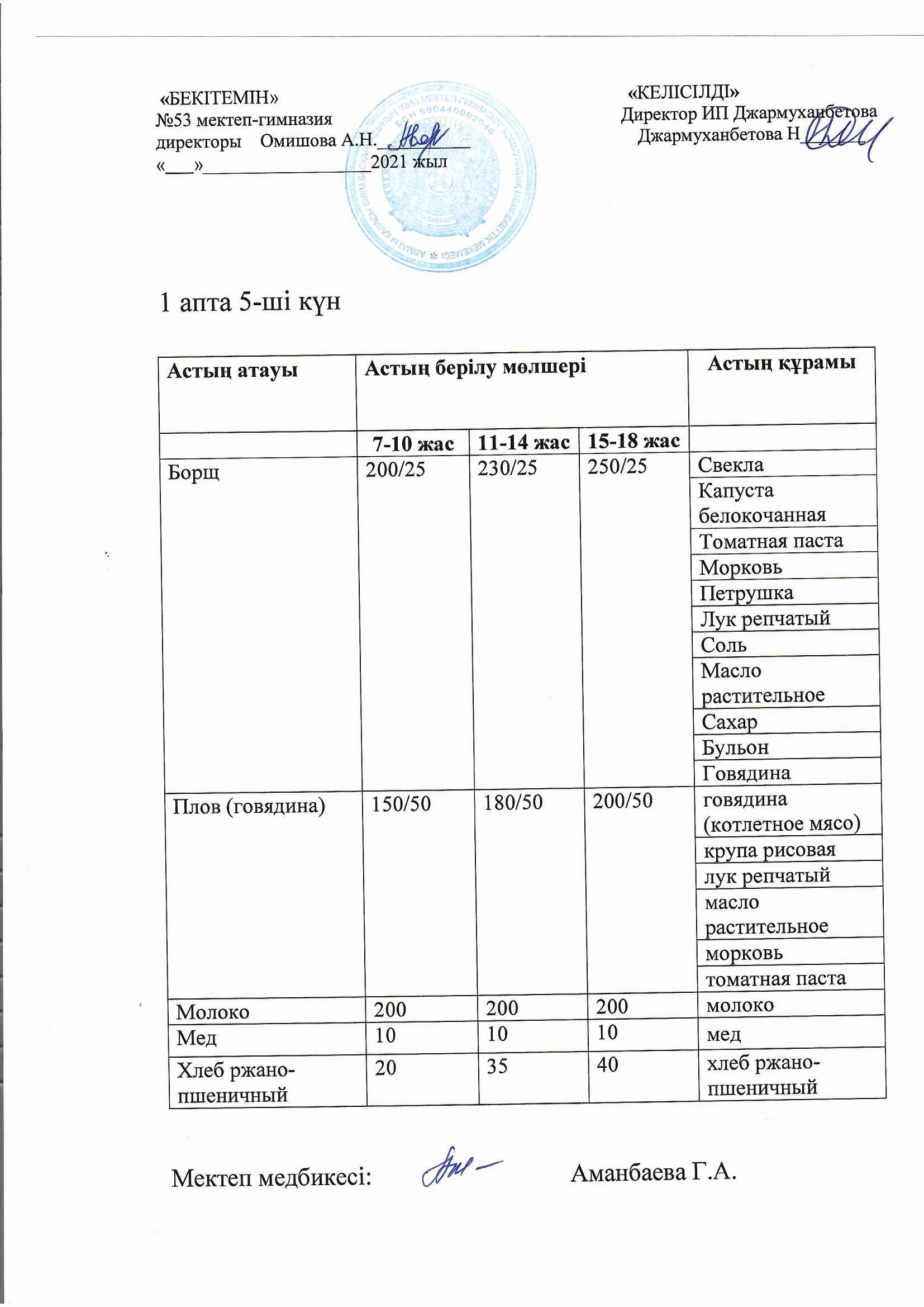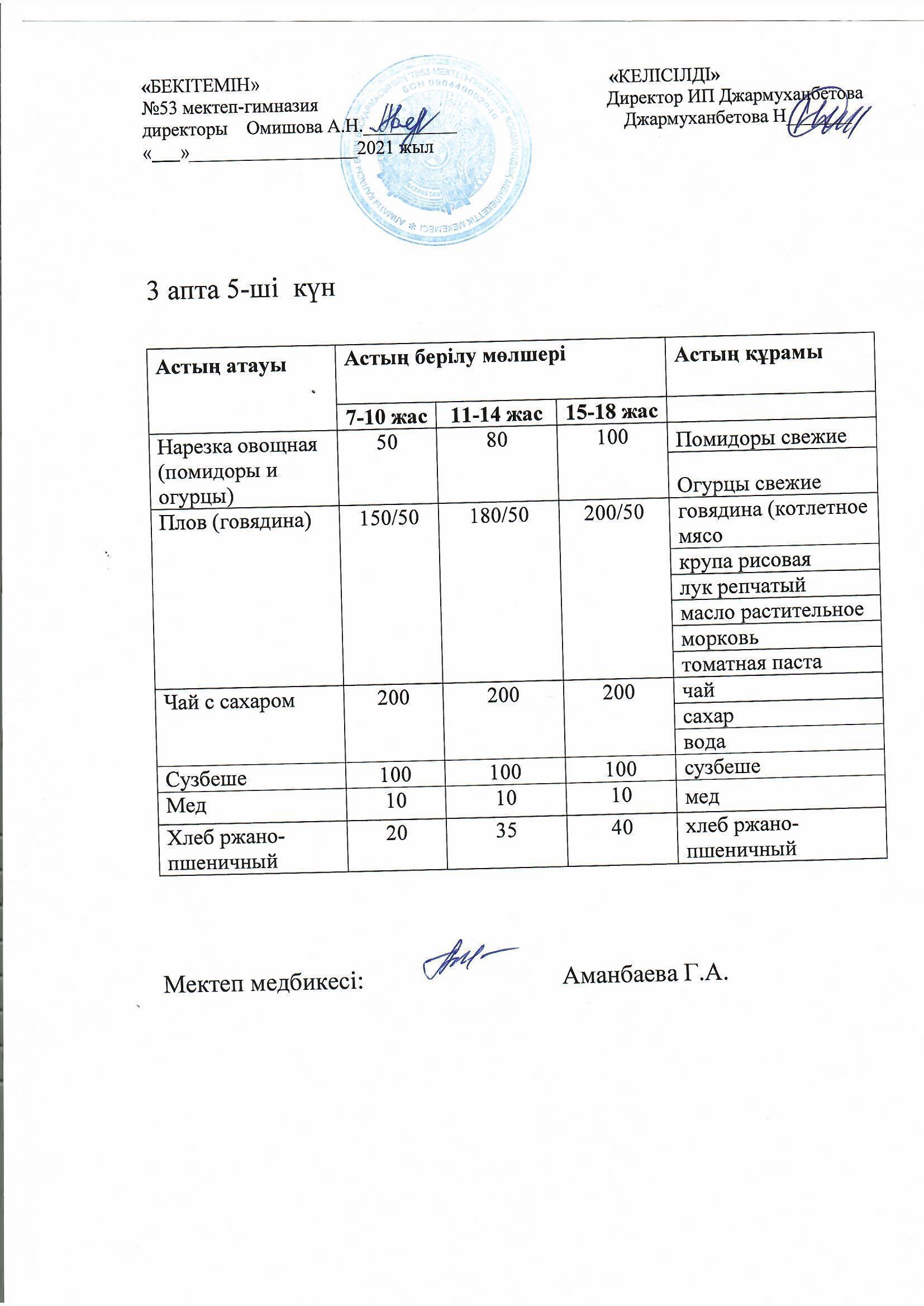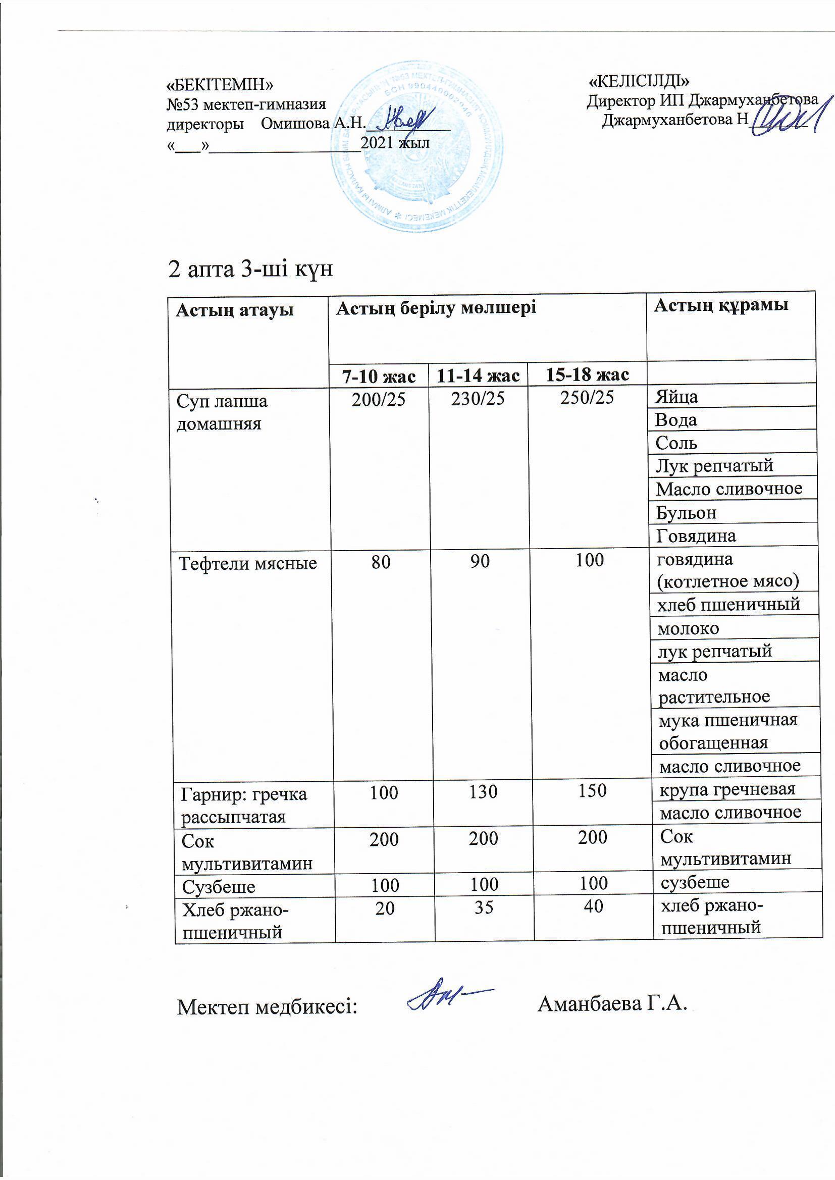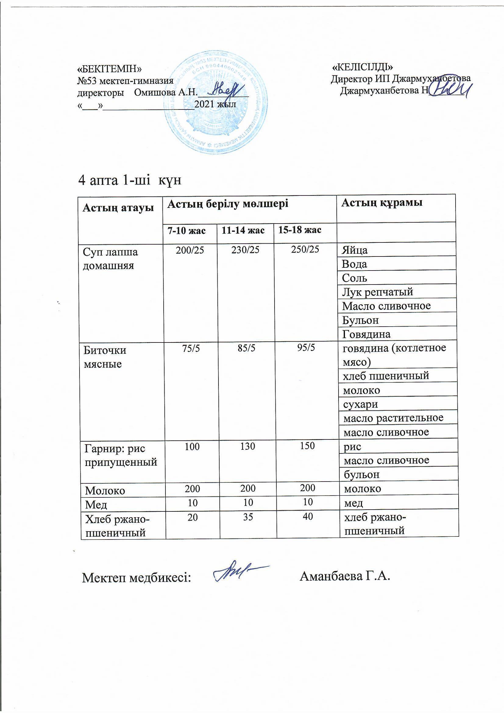 Білім басқармасы тарапынан бекітілген ас мәзірі