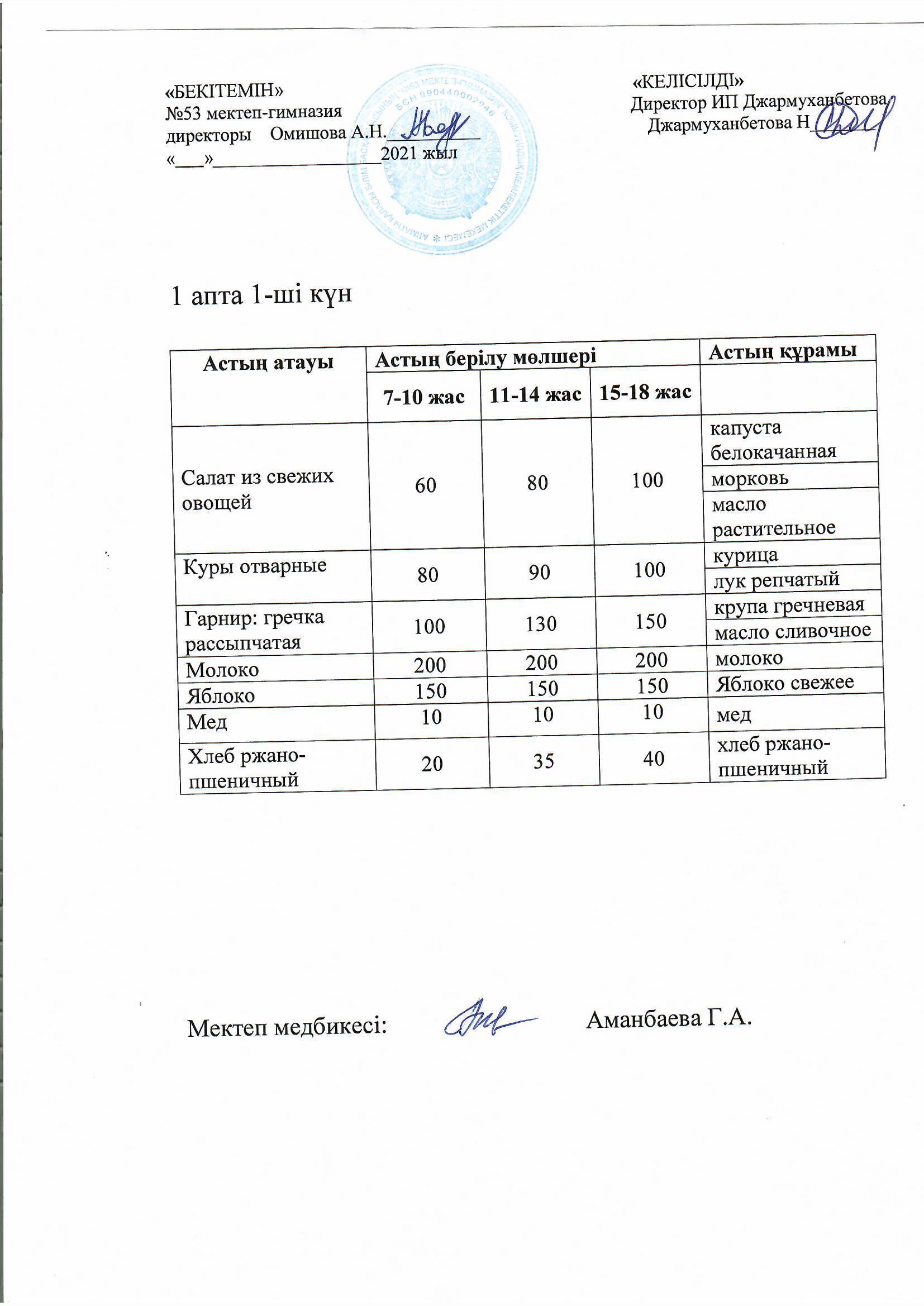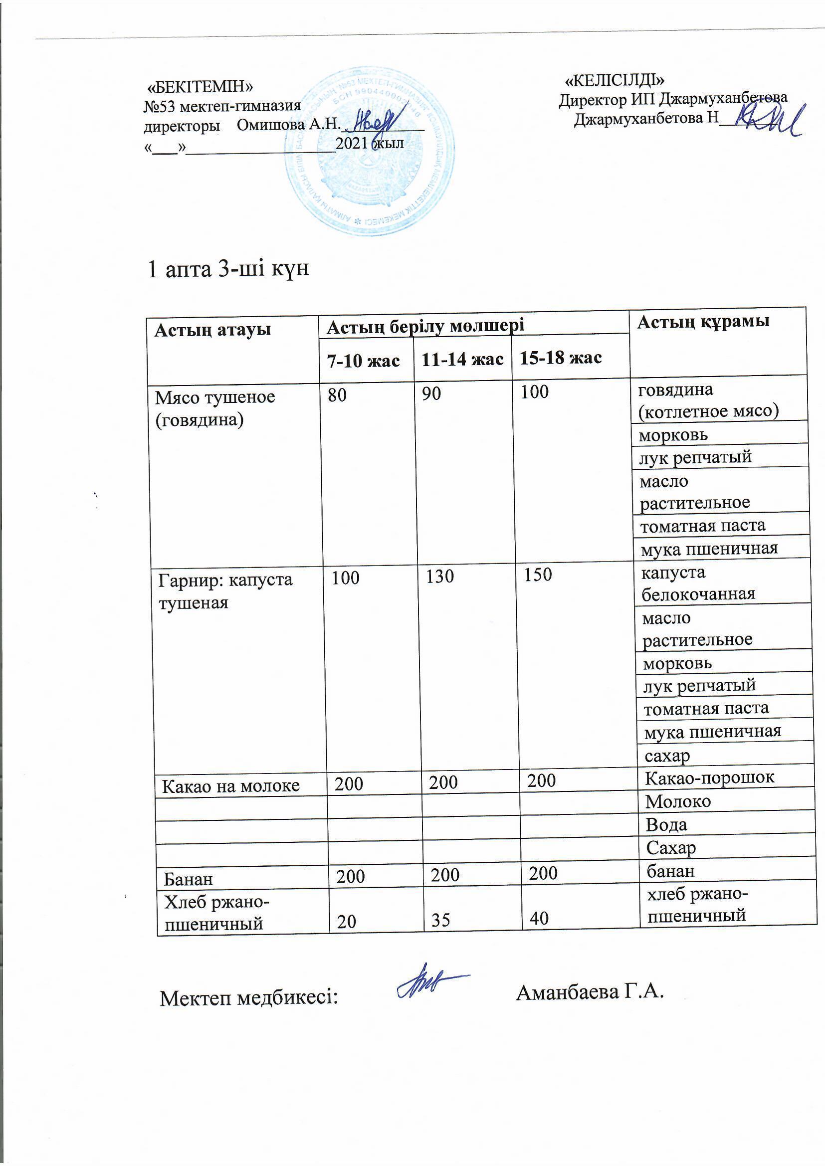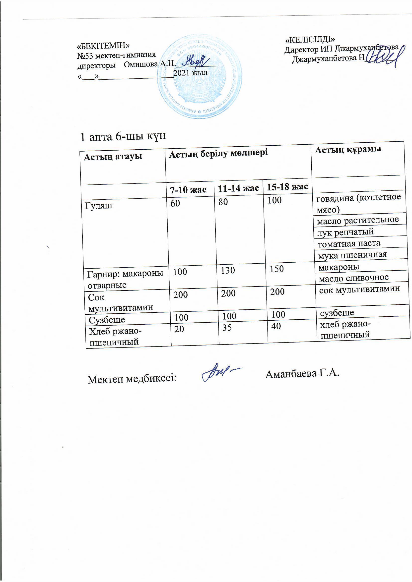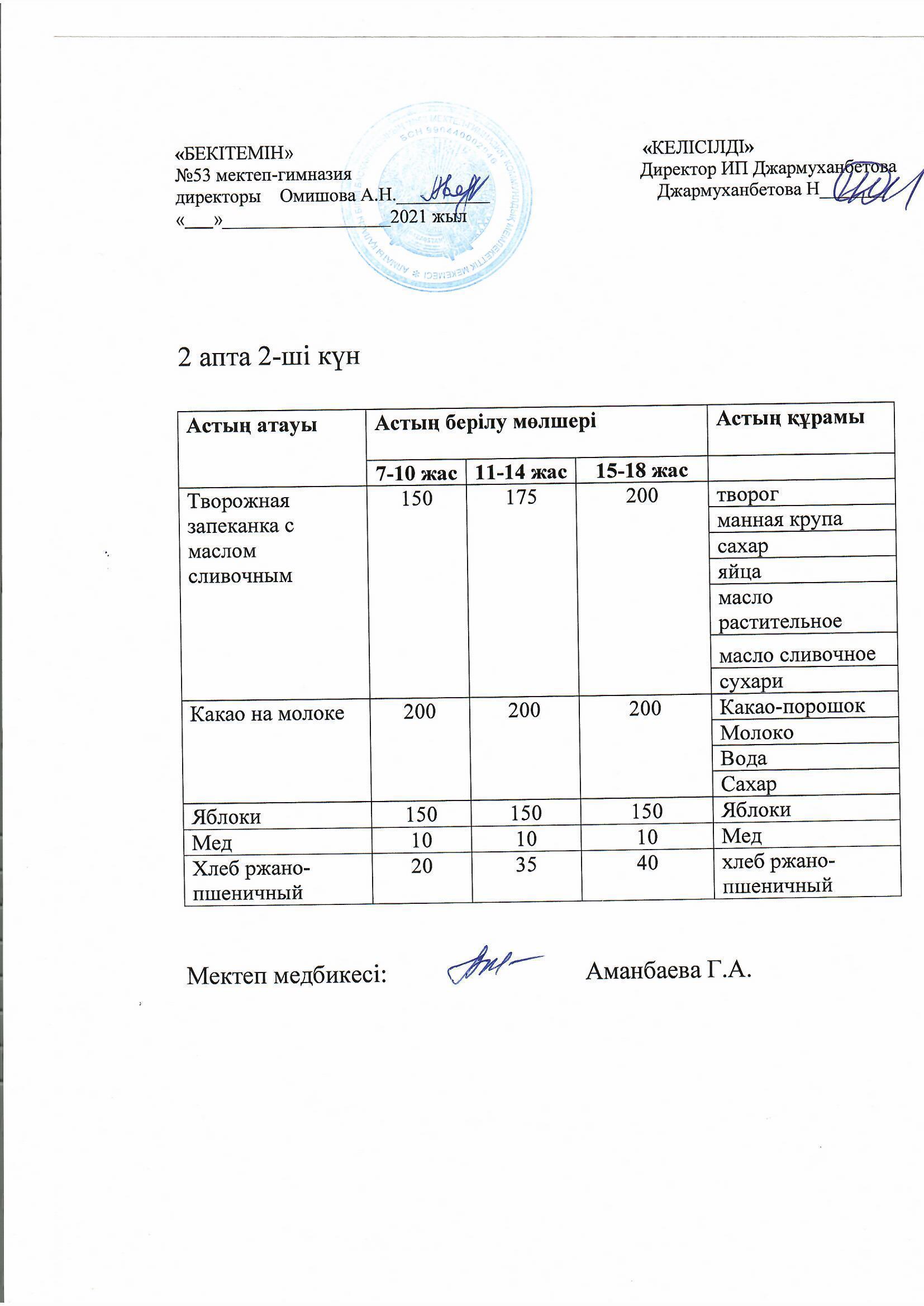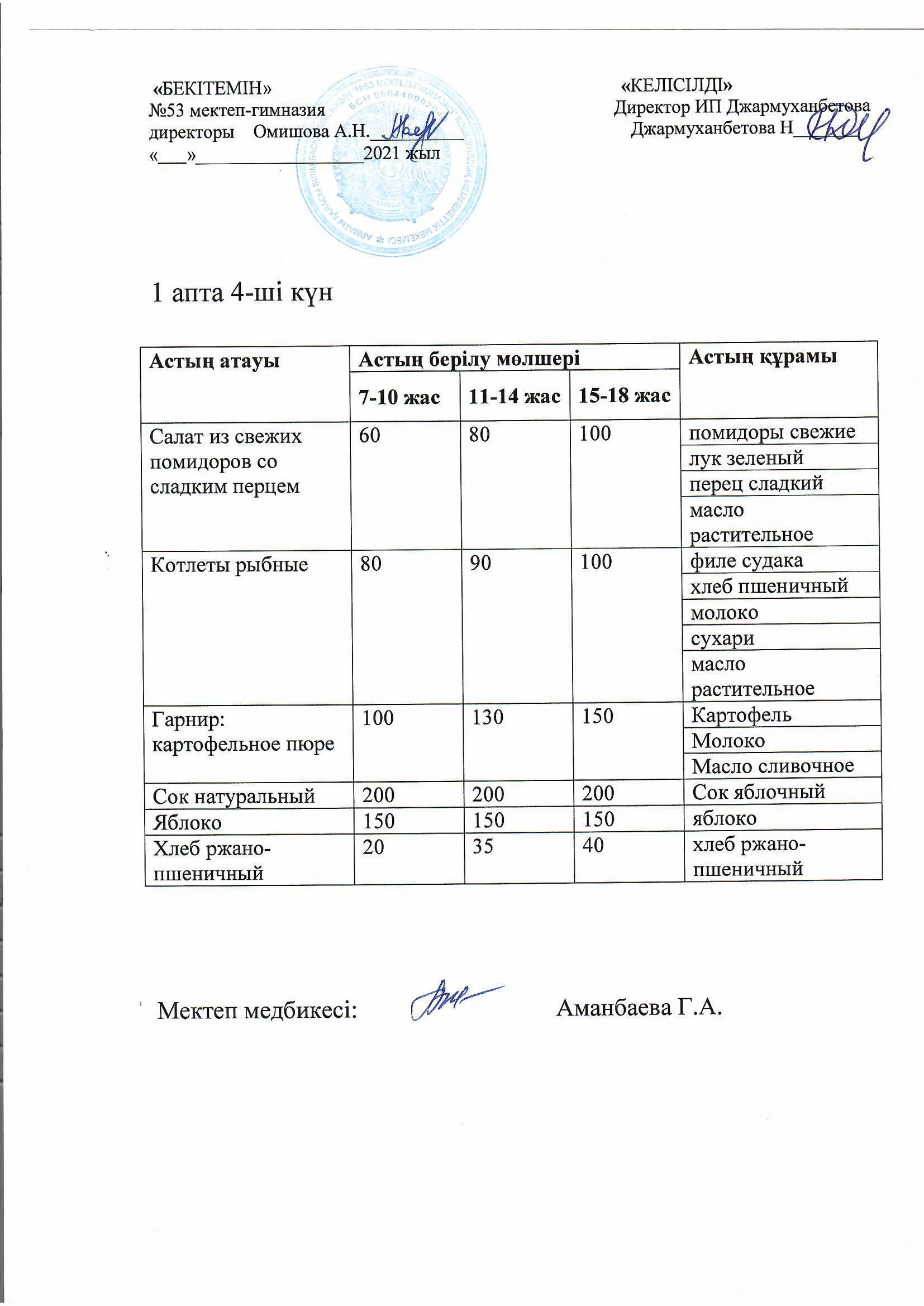 Білім басқармасы тарапынан бекітілген ас мәзірі