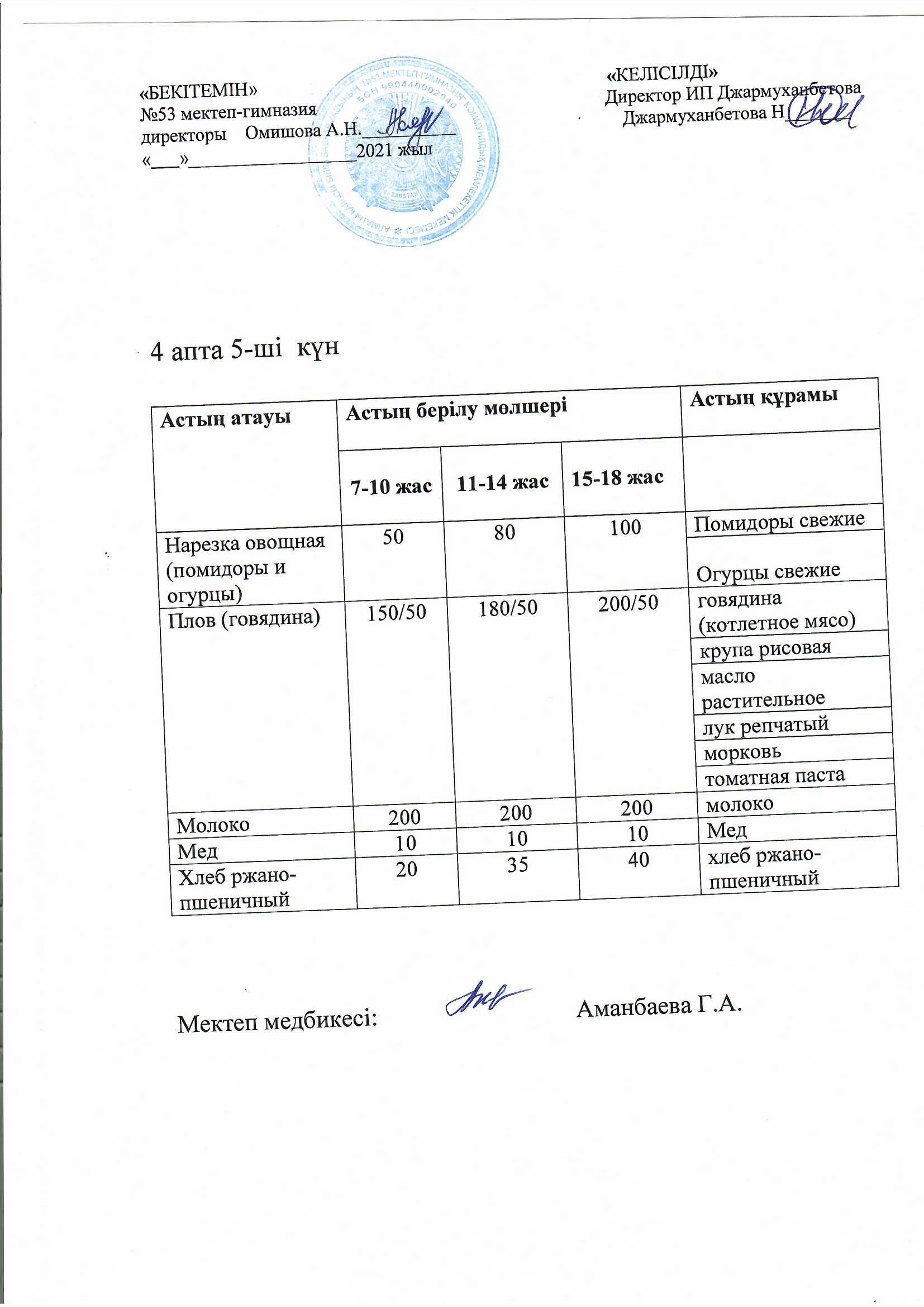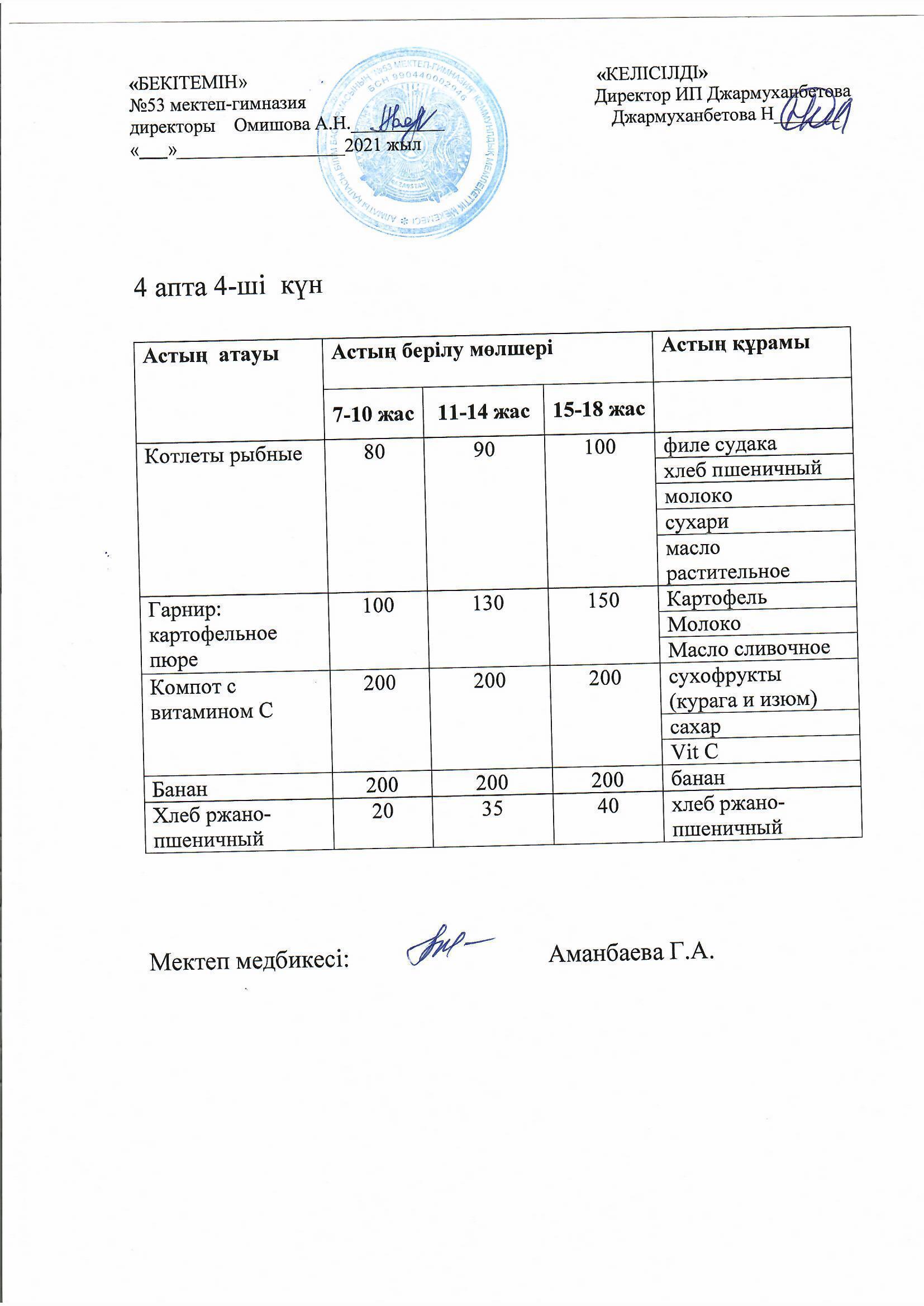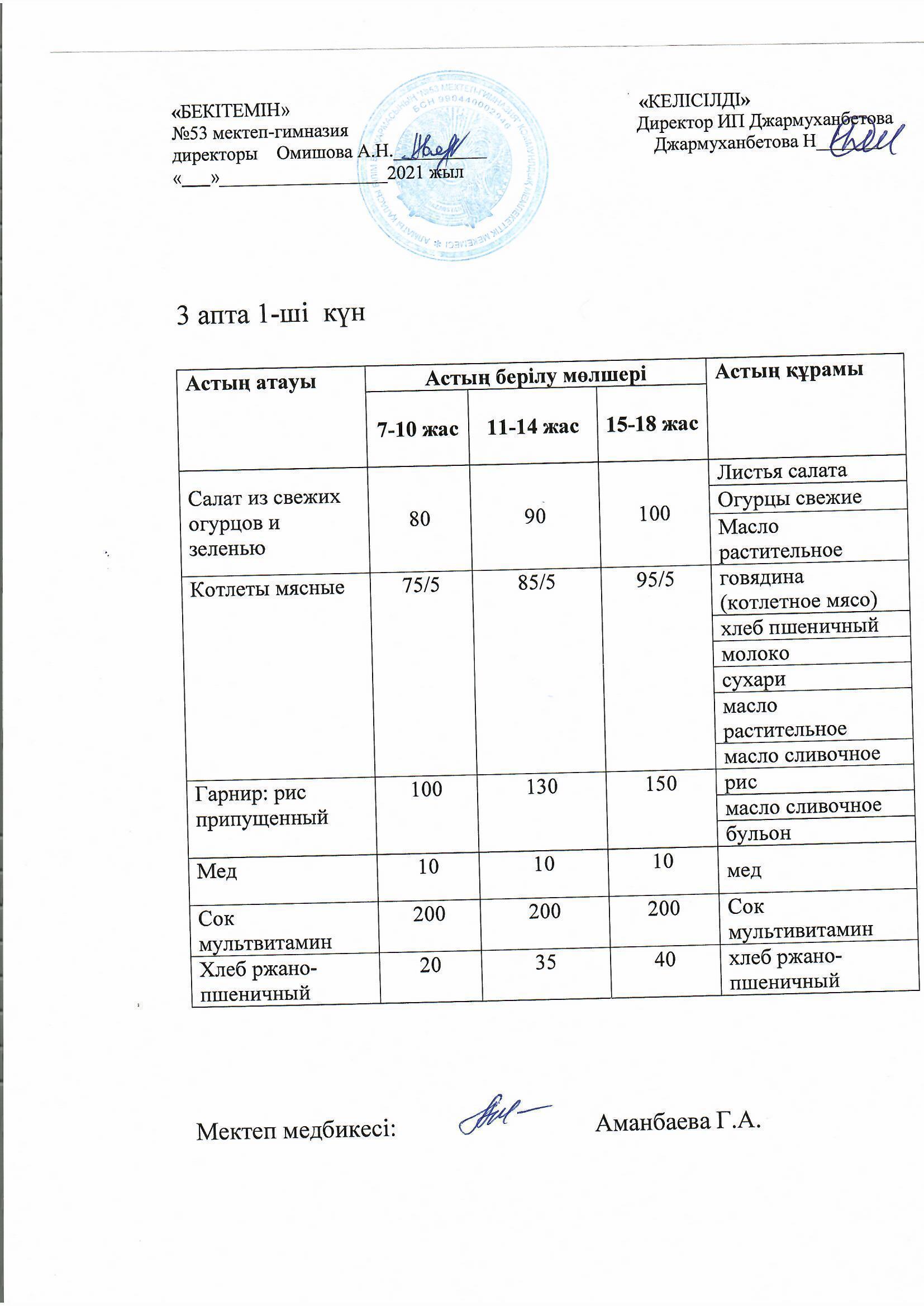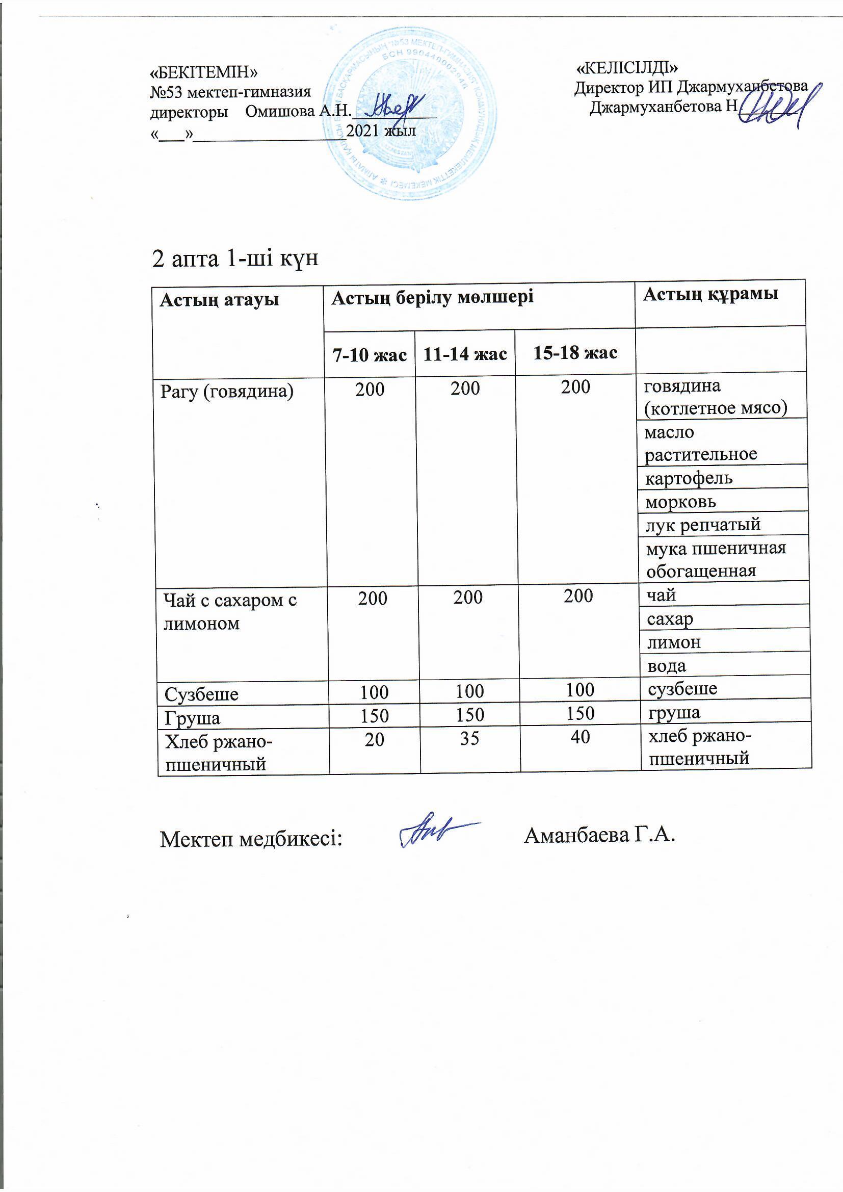 Білім басқармасы тарапынан бекітілген ас мәзірі