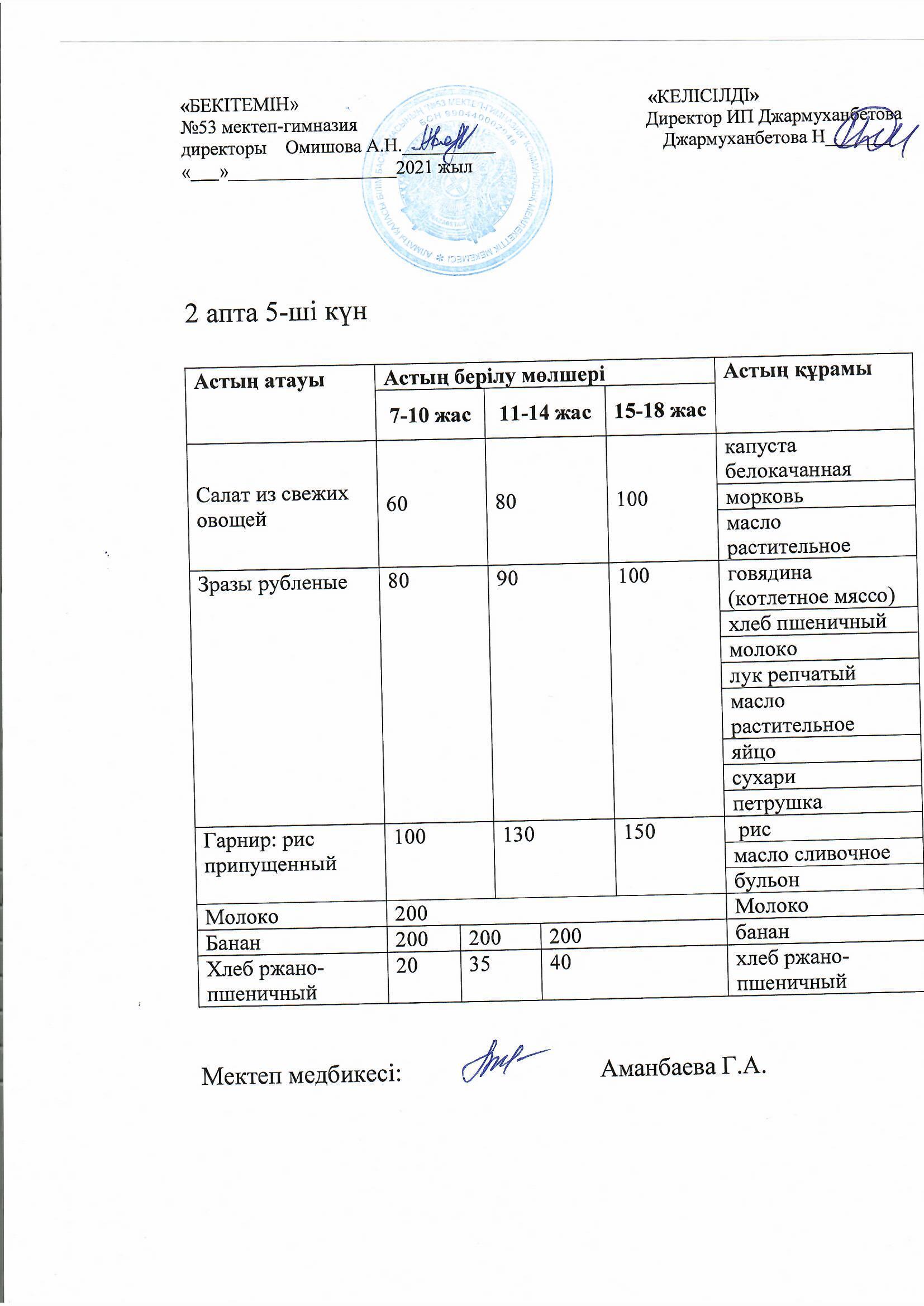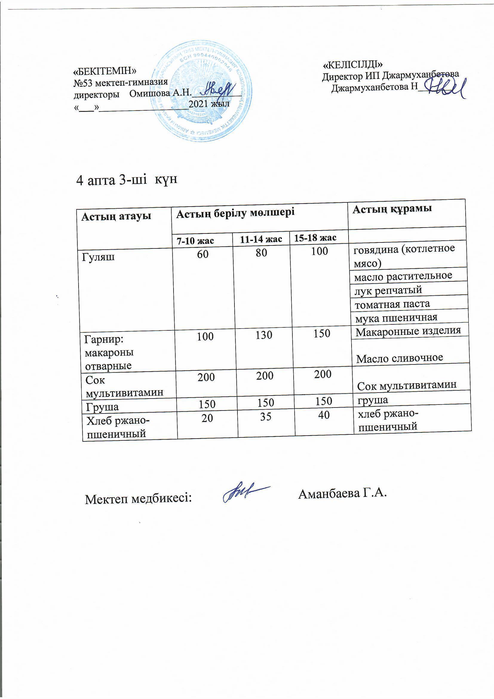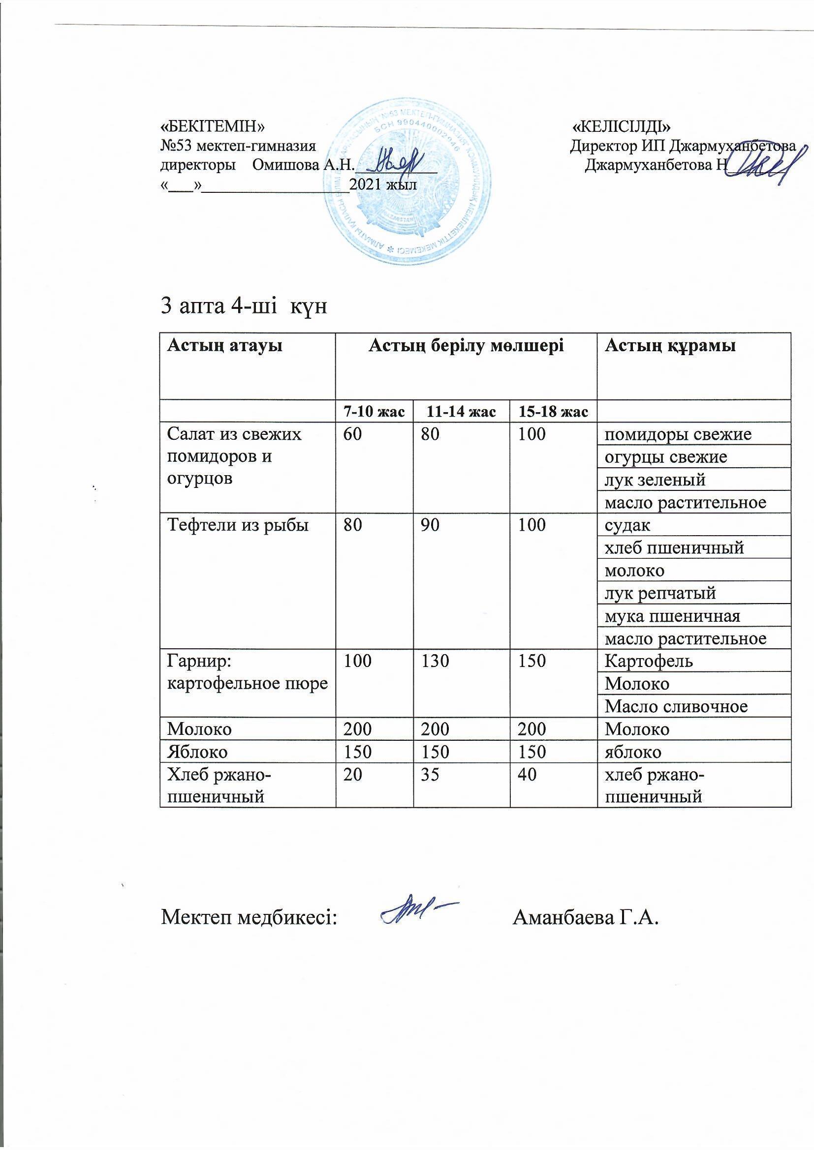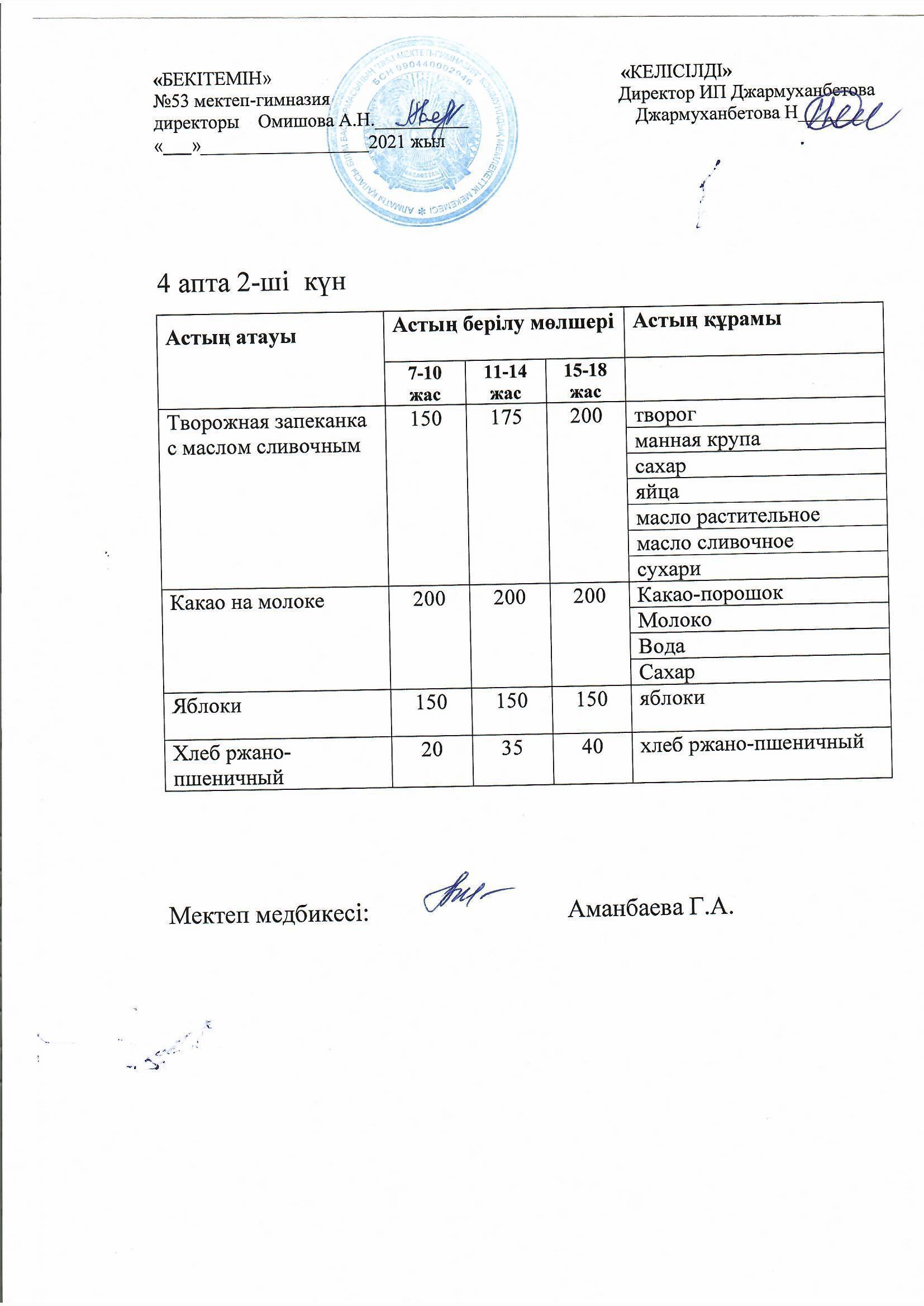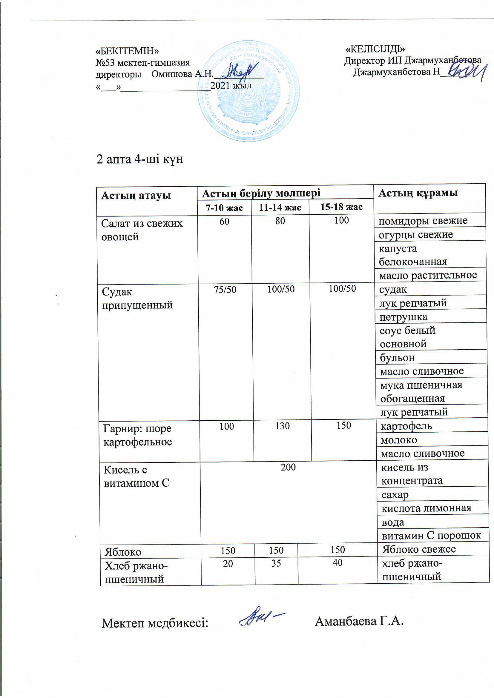 Білім басқармасы тарапынан бекітілген ас мәзірі