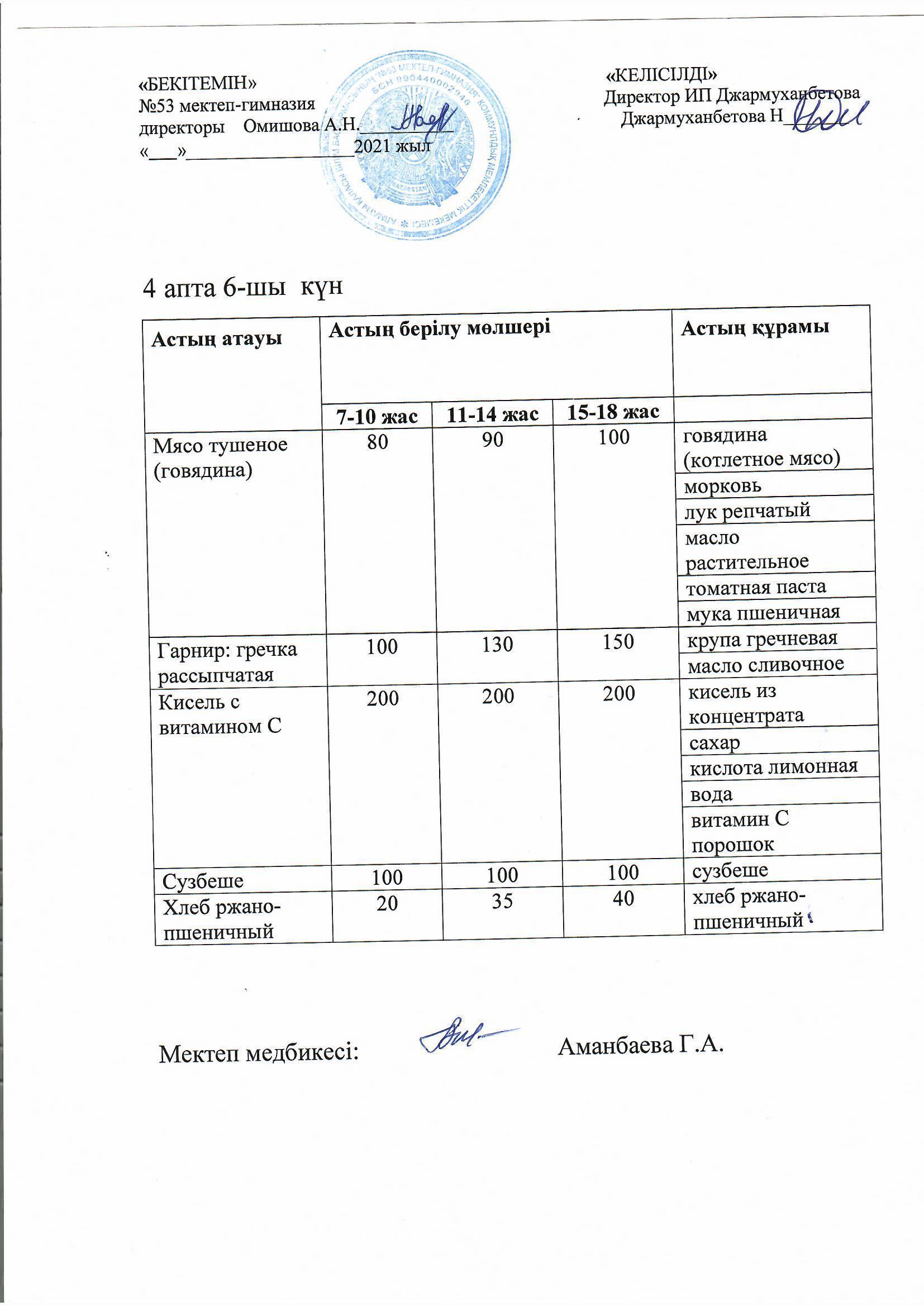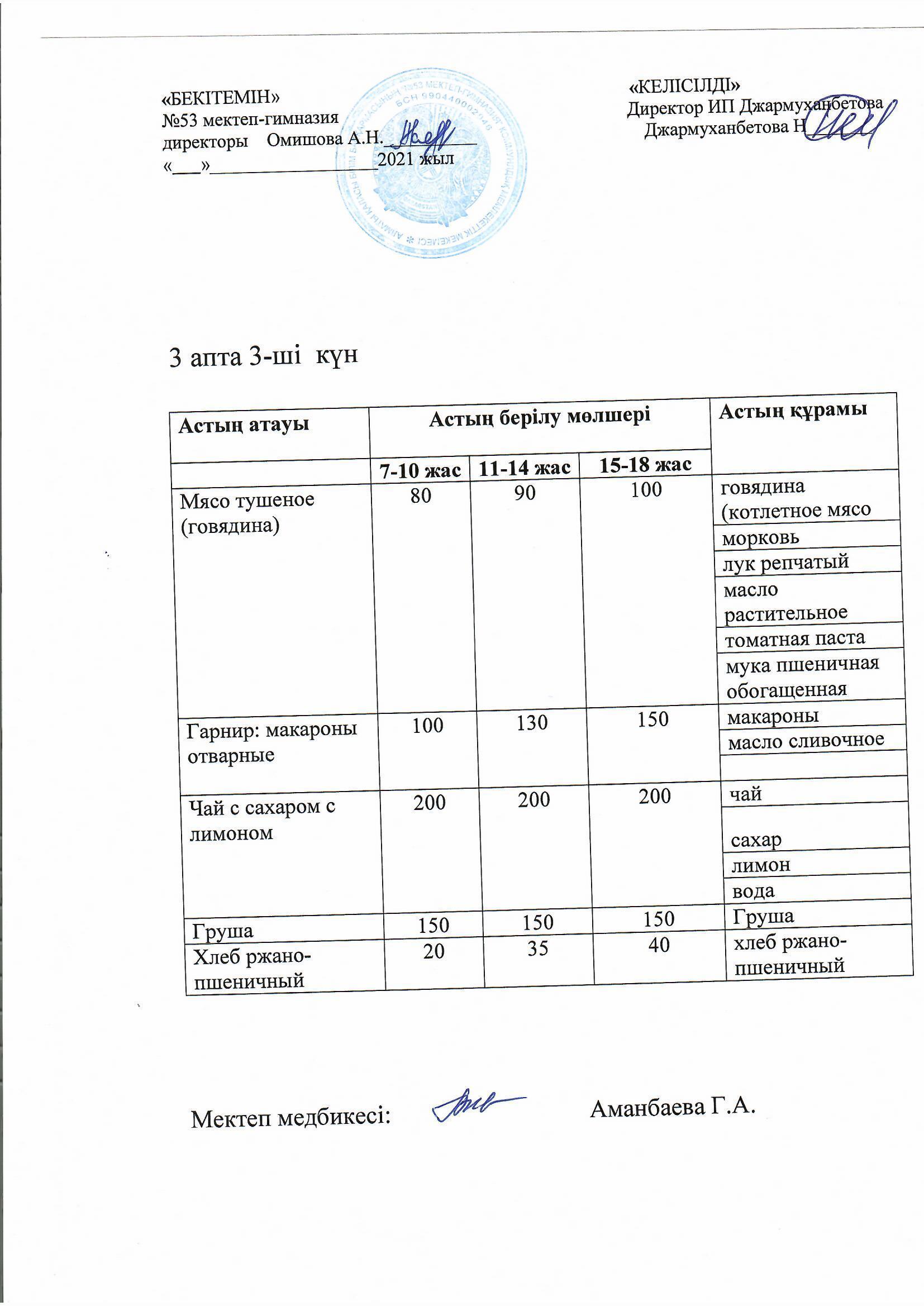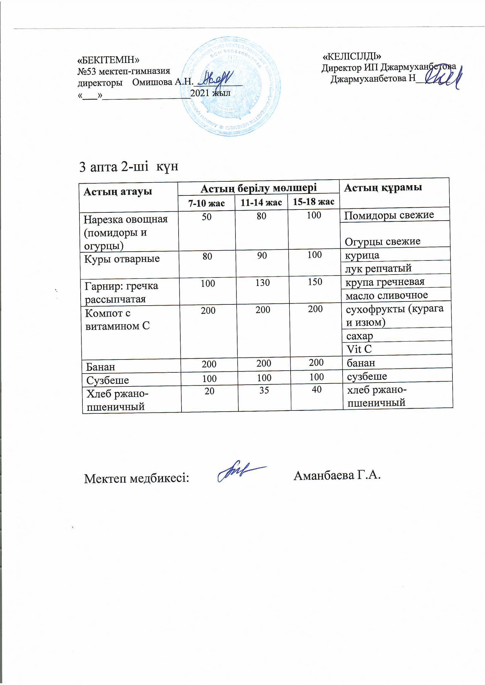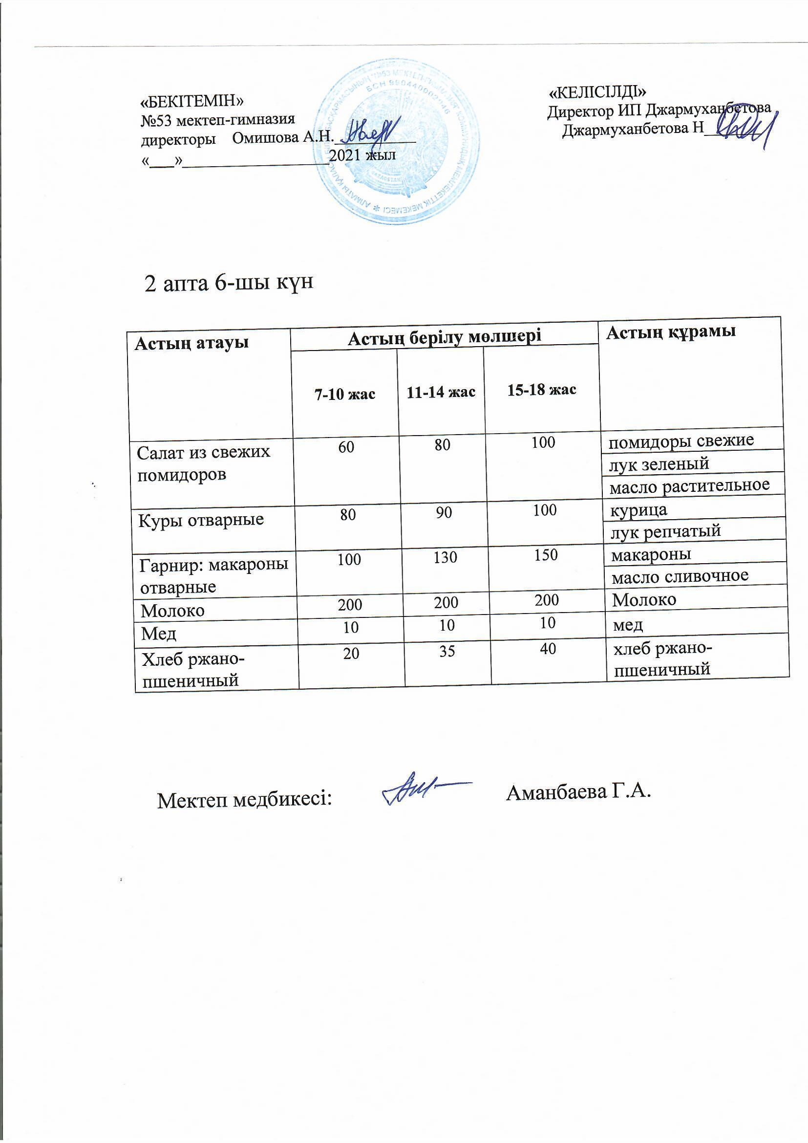 Білім басқармасы тарапынан бекітілген ас мәзірі