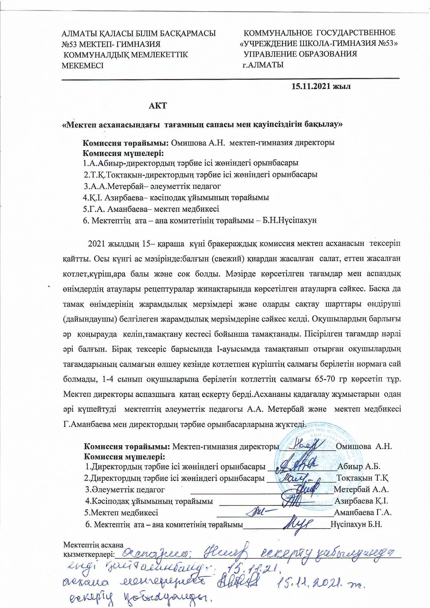 Мектеп асханасындағы тағамның сапасы мен қауіпсіздігін бақылау акті