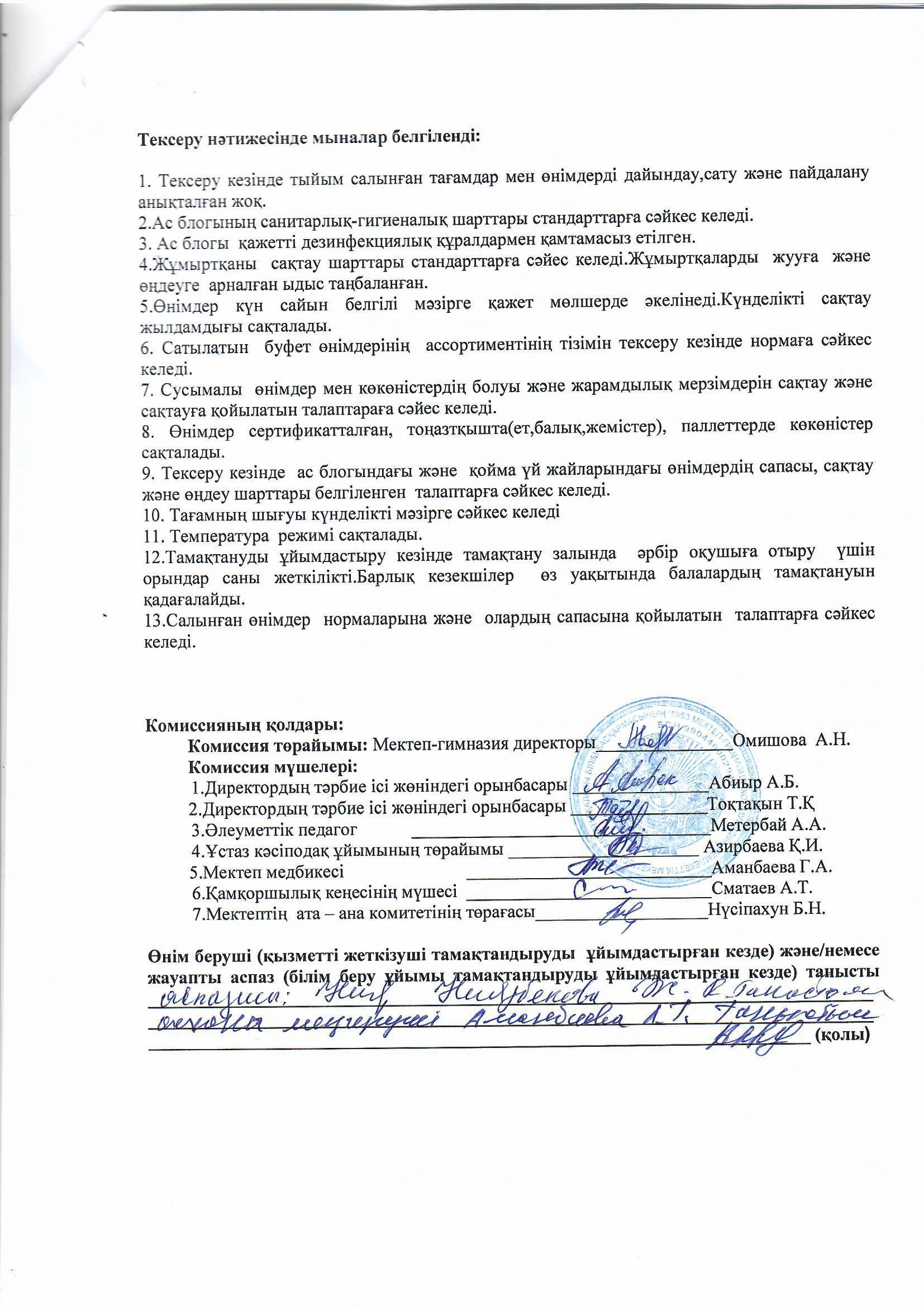 Тамақтандырудың сапасына мониторинг жүргізу актісі