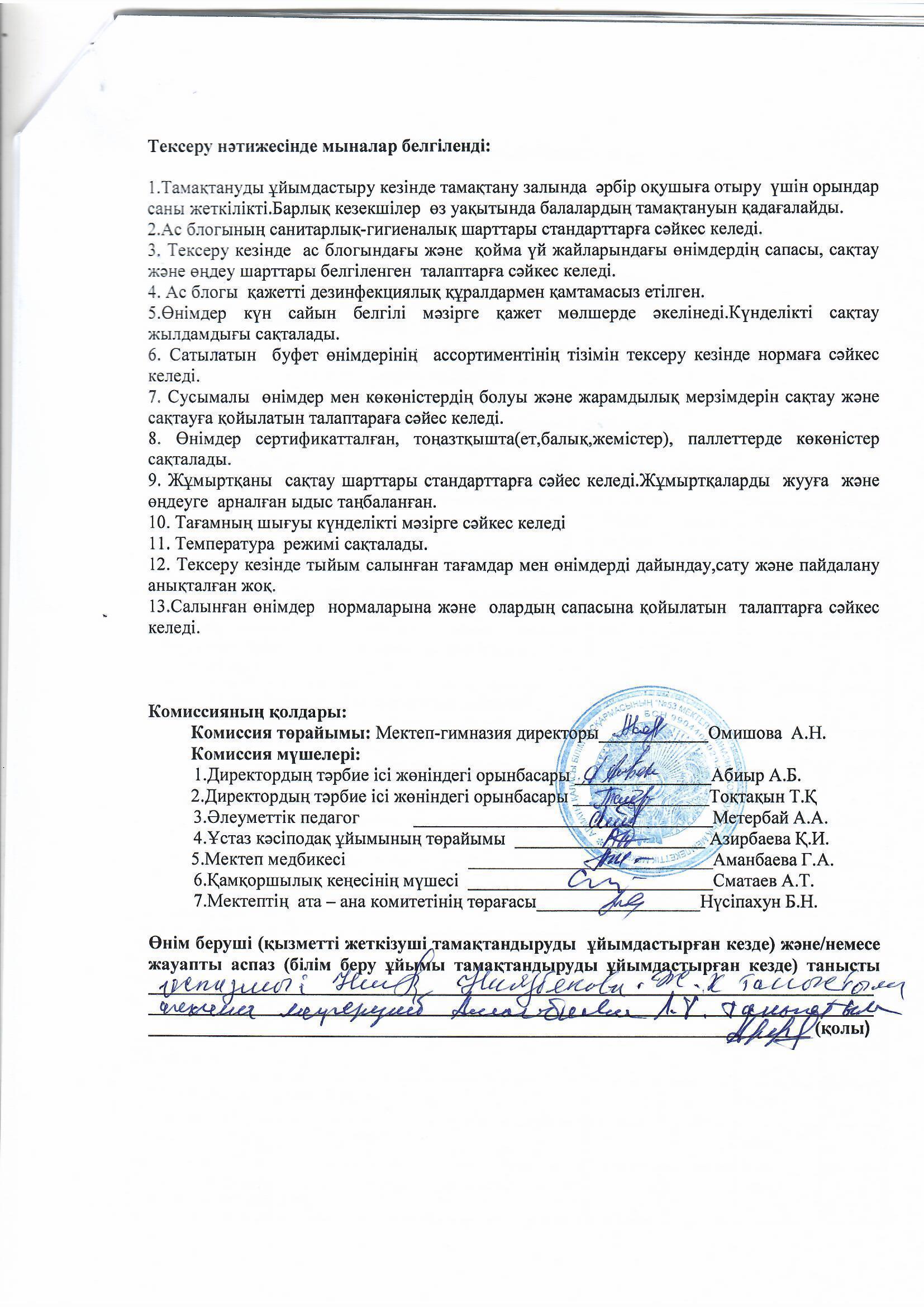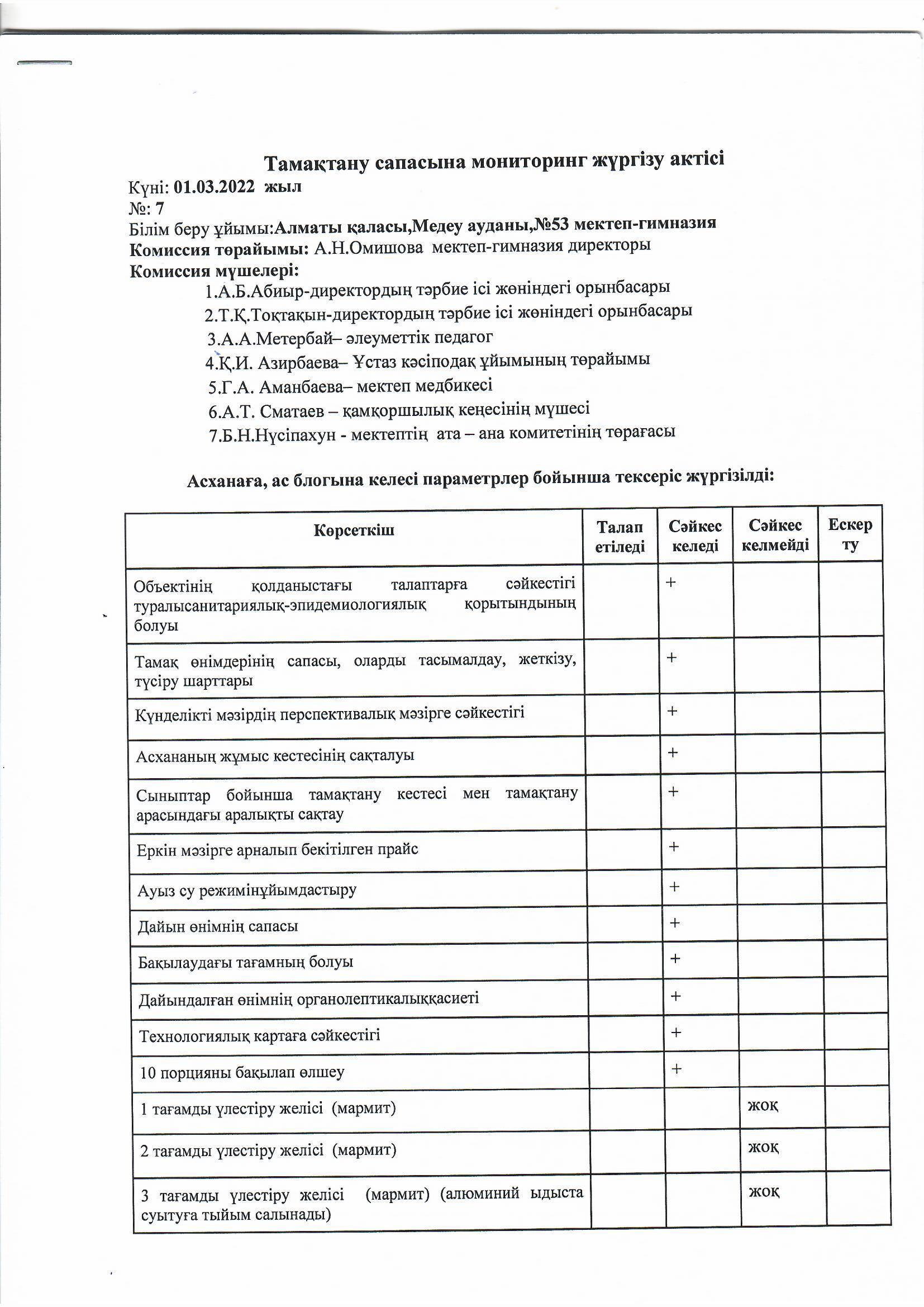 » Тамақтандырудың сапасына мониторинг жүргізу актісі